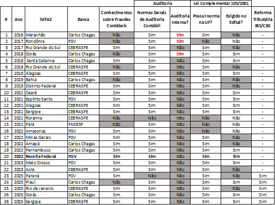 Além da auditoria, é recorrente a exigência de conhecimentos em contabilidade geral e, eventualmente, em contabilidade de custos — temas que serão objeto de análise em futuros estudos. Em um primeiro momento, observou-se que a maioria das SEFAZ incluía noções gerais de auditoria independente nos editais.