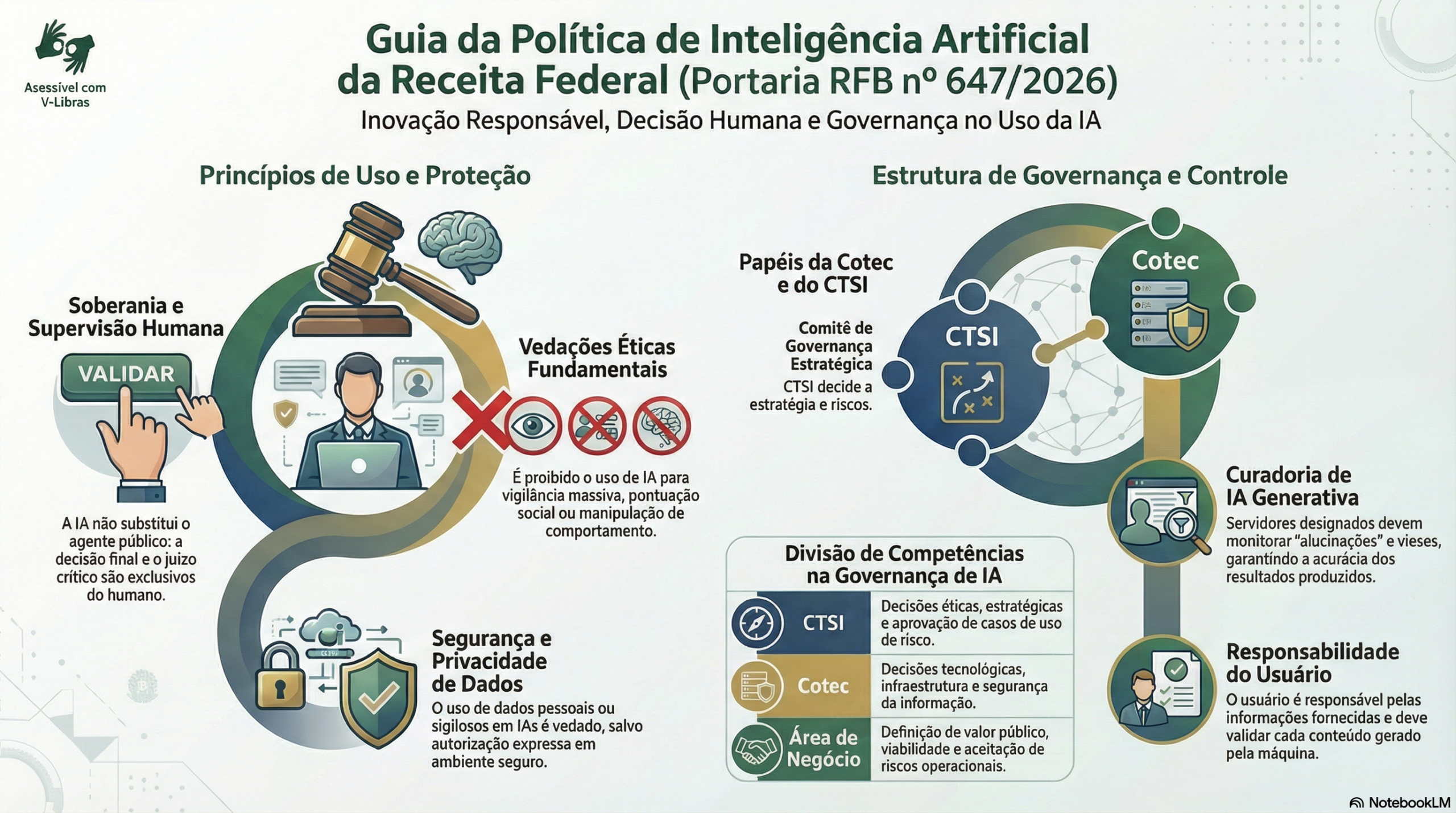 A Receita Federal do Brasil publicou hoje a Portaria nº 647/2026, estabelecendo a Política de Inteligência Artificial da Receita Federal do Brasil, definindo as normas para o uso ético e seguro dessa tecnologia no órgão. O documento detalha diretrizes e princípios fundamentais, como a necessidade de supervisão humana constante e a proteção rigorosa de dados sigilosos.